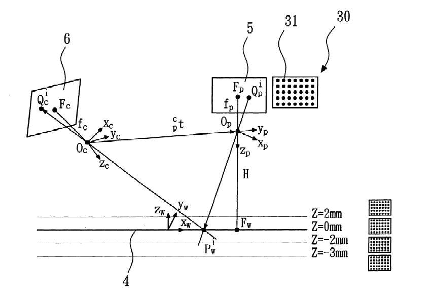 (g)利用該影像擷取裝置擷取該等圓點之影像;及(h)於垂直方向移動該平台,以取得更多之校正點,再以最小平方法求得該投射裝置、該影像擷取裝置與該平台之座標轉換關係。藉此,在應用時具有較大之彈性,可縮短系統架設時間,同時因與實際物理架構吻合,且不需移動任何機構,因此具有較高之量測精度。