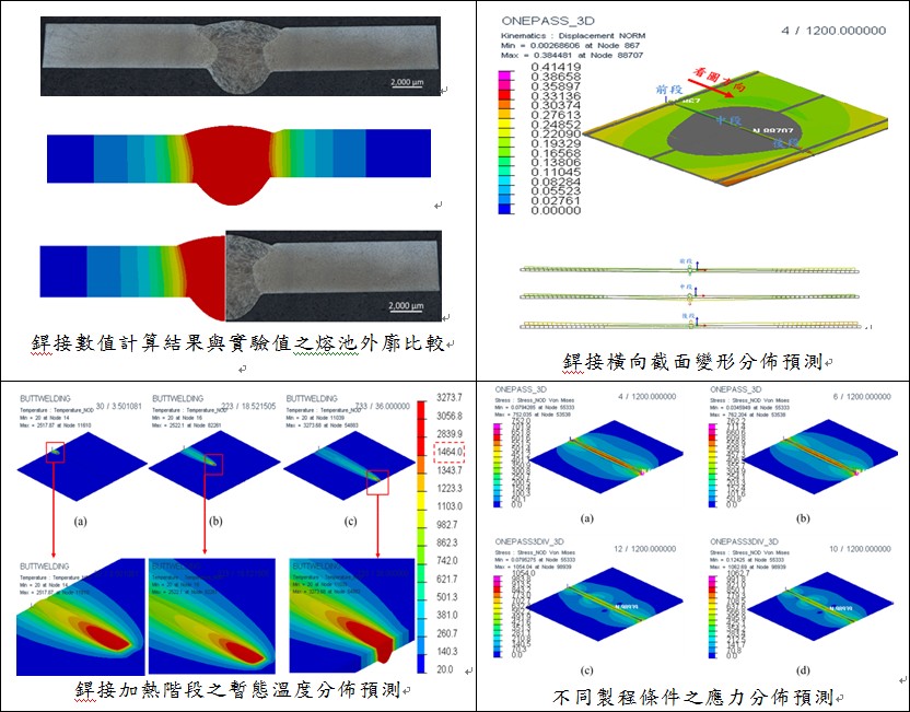 銲接變異解析技術係應用銲接製程模擬解析之方法,利用不同的銲接熱源模型,同時考慮材料相變行為理論,從結合熱傳(Heat Transfer)、冶金相變(Metallurgy)與結構應力(Mechanical)等領域進行模擬計算,最後得到銲接/組裝變異結果(銲道熔池外廓及加熱、冷卻溫度歷程、暫態溫度分佈、變形分佈及應力分佈等)之預測與解析,即時回饋銲接設計端,進一步探討不同的銲接製程條件對整體銲件的影響,找出最合適的銲接工序。