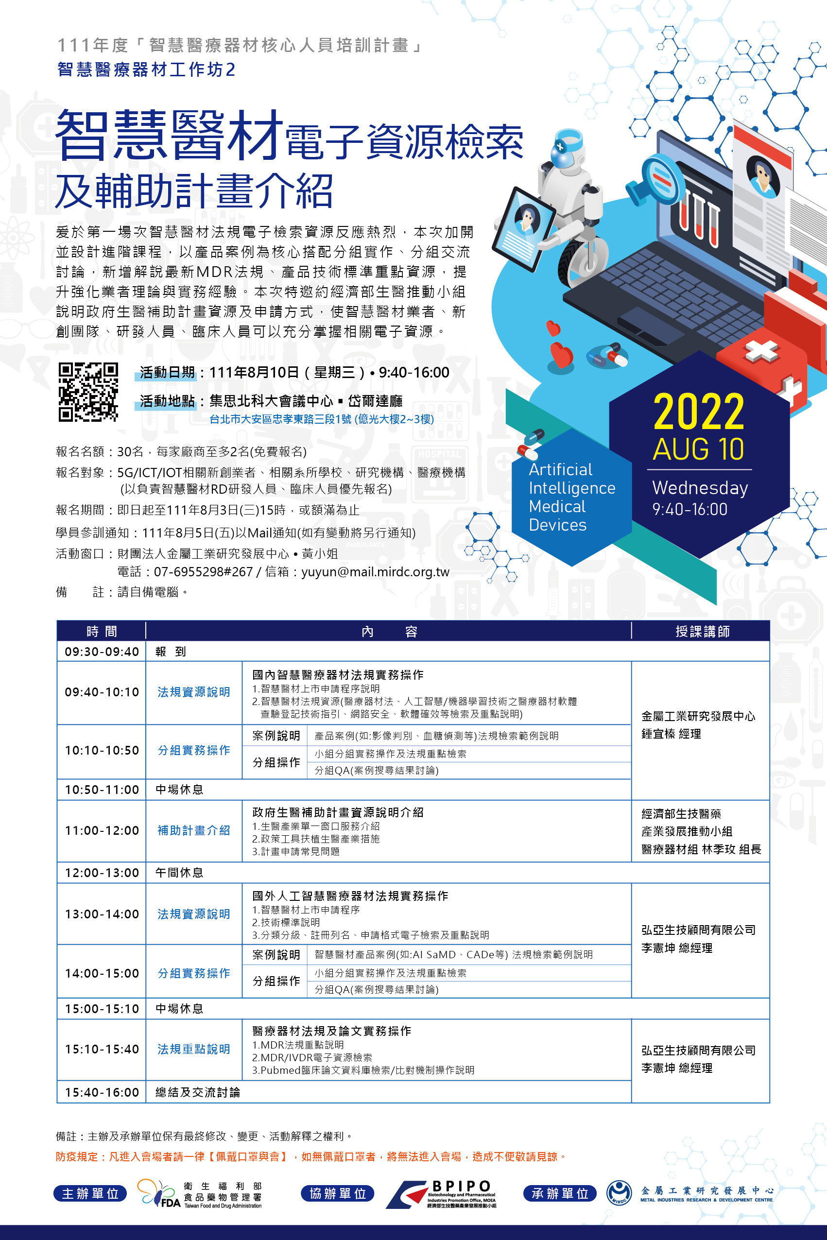 內容 爰於第一場次智慧醫材法規電子檢索資源反應熱烈,本次加開並設計進階課程,以產品案例為核心搭配分組實作、分組交流討論,新增解說最新MDR法規、產品技術標準重點資源,提升強化業者理論與實務經驗。本次特邀約經濟部生醫推動小組說明政府生醫補助計畫資源及申請方式,使智慧醫材業者、新創團隊、研發人員、臨床人員可以充分掌握相關電子資源。