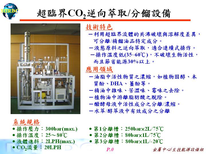 技術現況敘述 超臨界二氧化碳液相萃取設備技術:針對液體原料,使用超臨界二氧化碳為萃取劑,以填充管柱提高超臨界二氧化碳與液相原料間之質傳效果,並以變溫回流與溫度梯度萃取技術,提高特定有效成分之分離與濃縮效率。