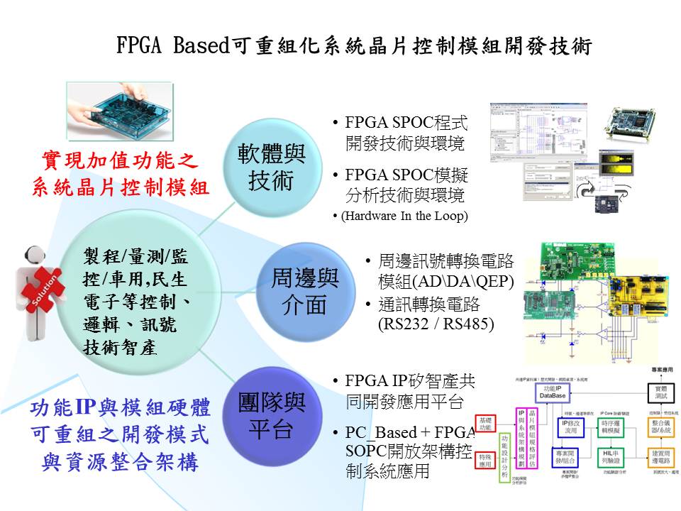 技術現況敘述 應用FPGA與內嵌軟核心處理器構成SOPC系統晶片,結合AD/DA/QEP/RS232等周邊IP矽智產之整合重組建立於精微製造所需之伺服、訊號處理與程序控制模組,使用於製造、量測、組裝與自動化等不同領域。
