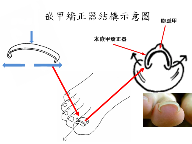 技術現況敘述 現行市面上相關之矯正器,於操作上需專業人員協助,操作不便,且矯正器在鞋內的濕熱環境中恐有生鏽、腐蝕的可能。