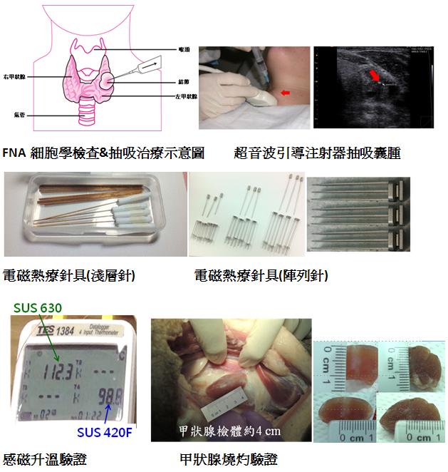 技術現況敘述 本技術開發應用於較淺層之組織燒灼及抽吸功能的電磁熱療針具,所選用針頭為感磁材料、針身為不感磁材料,經由磁場將針頭感磁加熱至燒灼溫度,而針身不感磁即可做為隔熱段,避免周圍組織灼傷;熱療針設計為中空管柱,似一般注射針,可直接對患部進行囊液抽吸或藥物注射,免於二次入針。 針頭: 1、 以現行麻田散鐵系SUS420不鏽鋼或其他具導磁效果之醫療用不鏽鋼材料(鐵基合金、6系列不鏽鋼)。 2、 設計規格長度5至10mm;外徑0.8至1.2mm;內徑0.4至0.8mm;針尖倒角10至12度。 針身: 1、 以高強度、抗融、低/不導磁之SUS316不鏽鋼或氧化鋯陶瓷材料予以膠合。 2、 設計規格長度30至50mm;外徑1.2至1.6mm;內徑0.4至0.8mm。 手持部: 1、 以低/不導磁之金屬、陶瓷或PEEK材料膠合。 2、 符合魯爾(ISO 594-1、ISO 594-2之接頭),可直接與注射針接合。 3、 設計規格長度30至50mm;外徑2.5mm;內徑0.4至0.8mm。 溫度感測: 1、 配置Sheath型Thermocouples;3系列不鏽鋼材質。 2、 設計規格為可撓式,外徑0.3mm。 此開發針具經由超音波引導至患部,配合外部電磁加熱機台進行治療;中空針具可進行囊腫吸取、檢體採集及藥物輸送,便於病理取樣及供藥,免於二次入針。除應用於甲狀腺外,將可應用於其他淺層癌症及囊腫之治療,如淋巴腺、乳房、皮膚、鼻竇等位置;針具規格之改良也可能應用於深層臟器之燒灼治療手術。
