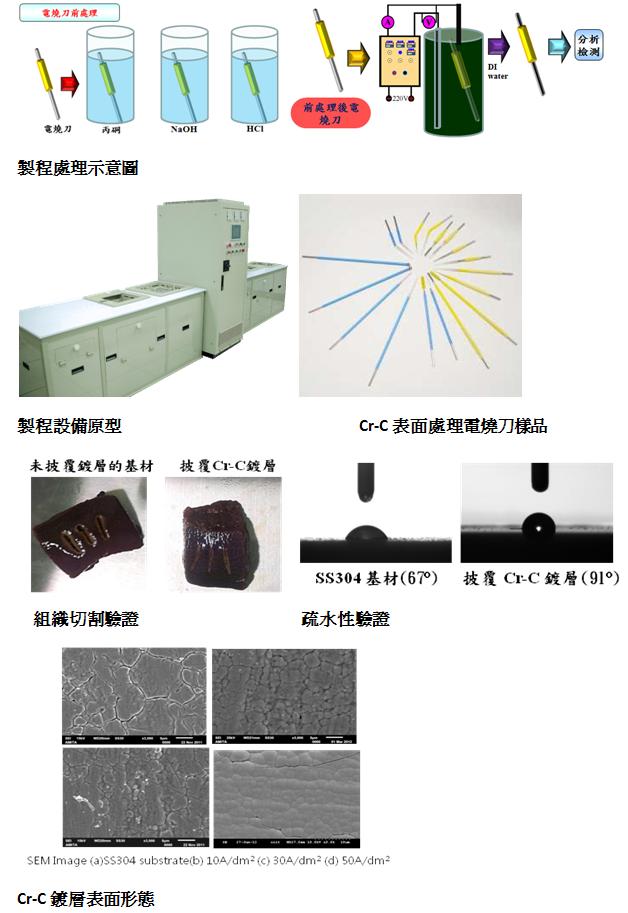 技術現況敘述 本製程技術改善電燒刀器械多以PTFE做為表面披覆材質,經電後將產生有毒氣體、組織沾黏及組織熱傷害等問題;因此開發電鍍鉻碳陶瓷鍍層,使得具高硬度、熱均性及疏水性之抗沾黏鍍層;建立專屬電化學沉積技術量產製程,得到最大量化產能。 碳化鉻陶瓷抗沾黏鍍層: 1、 以濕式電化學技術為開發基礎,鍍層分布均勻,且製程簡易、成本低。 2、 以碳化鉻陶瓷鍍層取得更佳的導電性、導熱性、耐蝕性、機械強度、疏水性等。 3、 以三價鉻取代六價鉻,改善製程風險及環境污染。 量產製程: 1、 設計並整合專屬製程流程設備,簡化繁瑣操作過程、減少人力成本及降低操作風險。 2、 快速投入GMP產線進行量產。 3、 降低設備建置成本。 此開發技術除應用於電燒相關抗沾黏器械外,也可跨足一般表面處理業者進行材料表面疏水性抗污處理,應用範圍相當廣泛。