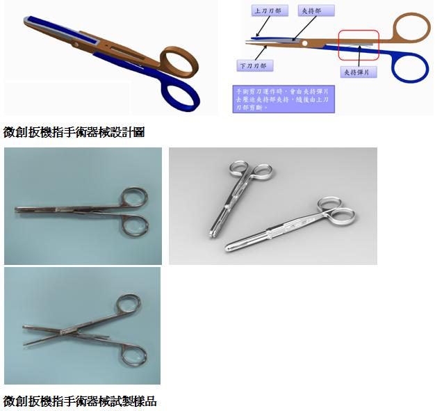 技術現況敘述 本器械針對較嚴重扳機指即狹窄性肌腱滑膜炎(第三或四級)開發,是常見的手部骨科疾病,應用微創概念及特殊設計之手術器械來改善現有臨麻治療成效;器械設計為具備將滑車組織快速切割、夾持並取出之機構,且有效避免周圍組織受傷。 手術器械設計: 1、 導入人因工程,使器械操作便利,醫師可單手操作。 2、 針對微創手術設計,可由約0.5cm之手術創口進入患處。 3、 可一次切斷滑車組織並取出,且不傷及周圍神經及軟組織。 此器械可配合超音波影像來引導至手術位置,且開發可延伸至多種部位滑車組織切斷及取出手術,如腕隧道症等重覆性使力傷害等病症。
