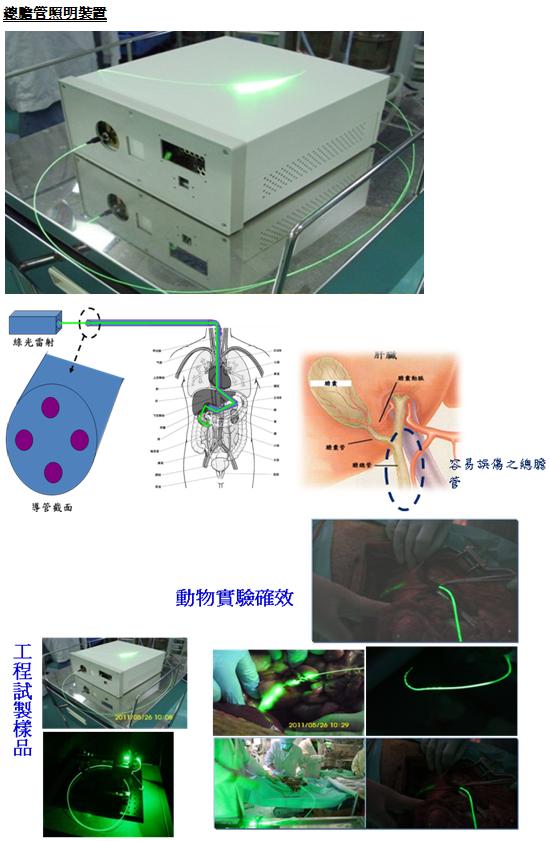 技術現況敘述 本技術針對肝、膽管切除手術中,改善光源及塑膠光纖探頭結構,使光纖之端面及側面可出光,有效利用出光效率達到均光的效果,提高光源對組織之辨識度及手術安全性。 光源設計: 1、 綠光雷射光源。 2、 光源辨識及安全性佳。 光纖模組: 1、 以微結構破壞塑膠光纖之全反射。 2、 提高光纖側面出光之量度與均勻性。 此系統開發,除應用於肝膽之外,也可應用於腹腔之內視鏡微創手術光源系統,以綠色且均勻的光源協助醫師手術之辨識及流暢度,減少視覺辨識風險。