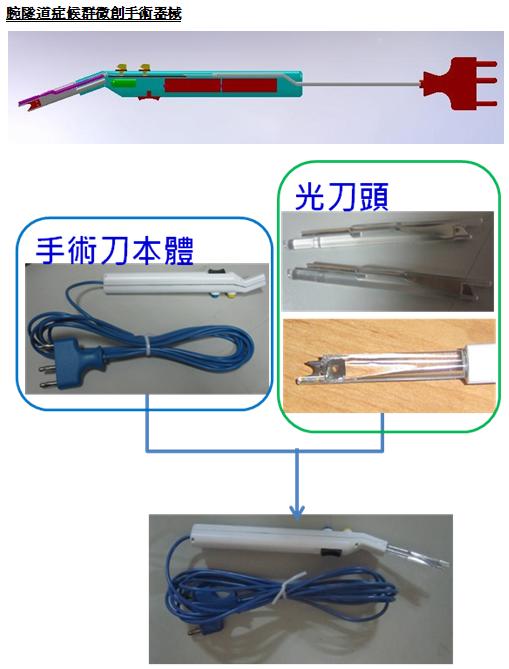 技術現況敘述 本技術針對腕隧道症候群微創手術開發,可應用於神經及整型外科,整合電燒、照明、內視鏡系統,減小創口及縮短微創手術準時間,加速手術進行。 ?棄式刀頭: 1、具經濟性且避免重複使用。 電燒功能: 1、 快速切割。 2、 切割傷口整齊。 共用高頻器: 1、 使用100kHz~10MHz之無線電波頻率。 照明裝置: 1、便於臨床手術觀察,減小風險。 此技術開發改善了傳統手術所造成的重大創口易傷及神經組織及感染之風險;搭可置換式電燒刀頭,切割效率高且衛生;本體含照明裝置,便於手術中觀察;多功能整合,使得創口小、操作性佳,傷口癒合快速且美觀。
