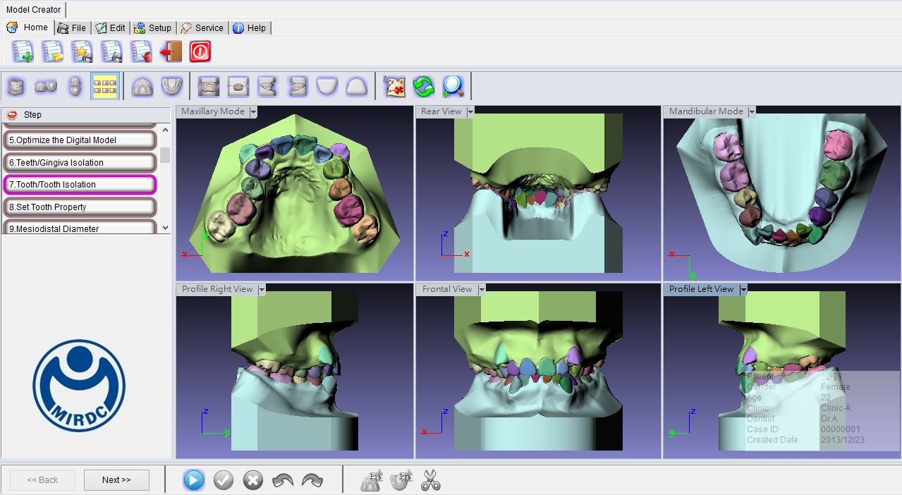 技術現況敘述 本技術可用開發一完整牙科矯正輔助軟體,包含已驗證完成之開發平台,完整矯正軟體模組功能,同時支援雲端資料交換。模組功能說明如下: 1.齒模之中心點校正 2.自動及手動修剪齒模功能 3.建立數位ABO基座,並與齒模結合 4.齒模影像最佳化編修 5.牙齦與牙齒影像分離技術 6.牙齒與牙齒影像分離技術 7.單顆牙齒屬性定義 8.齒模瀏覽模組可執行於具觸控功能之行動裝置。 8.牙科雲端管理系統具資料交換、權限管理、雲端矯正病例分析等功能