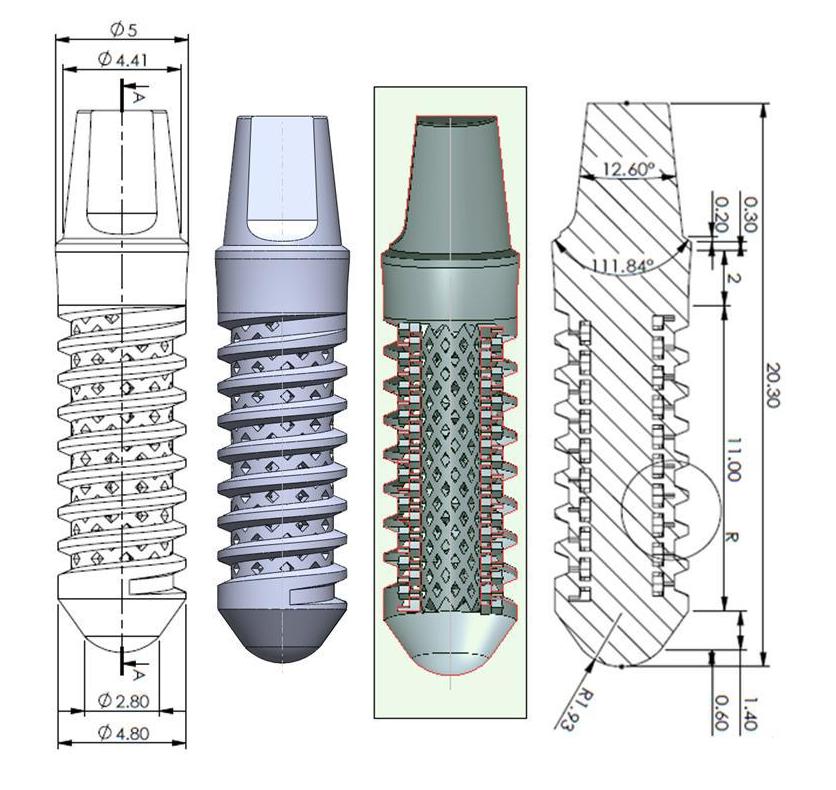 技術規格 1、後排牙用,直徑4.8mm,植體長度11mm,加上頭頸部及支台體總長度為20.3mm 2、孔隙為350~400μm,內部係呈現一開放且連續的孔隙構造,為一連續多面體且大小平均的孔隙結構