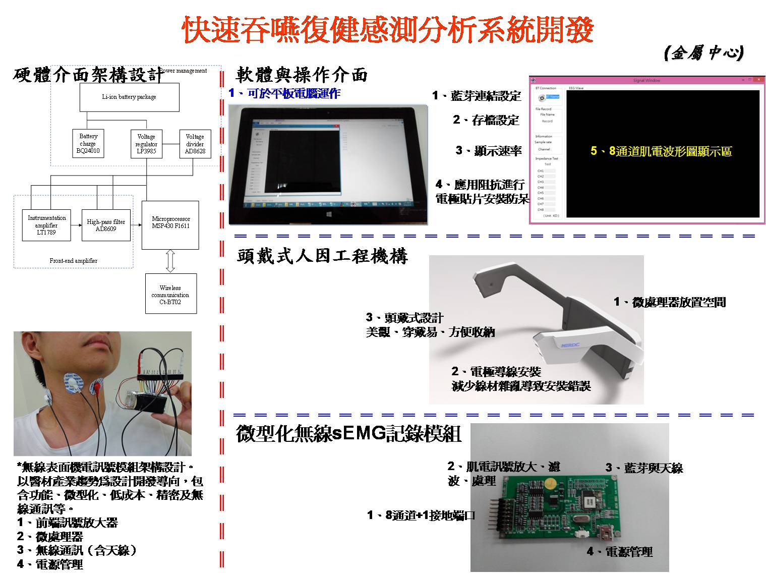 技術規格 規格樣品如附件,簡介如下: 1、 微型化無線肌電記錄模組:目前樣品為8通道(4對肌群共16條電極)+1接地(1條電極)之量測,包含肌電訊號放大、濾波、處理元件及藍芽與電源管理模組。 2、 姿態分析演算法:強調微小肌群量測及特定適應症統計,加強臨床上連結輔助診斷,逐步取代侵入式診斷,以及病例檔案之留存與分析。 3、 人因工程設計:樣品展現頭戴式穿戴裝置之科技感,應用於顏面及口咽部,有別於傳統醫療設備,減少患者心裡壓力及診間雜亂之線材;有效管理並分配線材,令醫護人員正確操作減少風險。 4、 行動裝置:軟體介面支持平板電腦、智慧型手機及電腦,醫護人員方便操作且第一時間掌握資訊。 5、 可客製化,開發不同臨床需求,應用於復健、神經、腦神經、老年醫學等,以及跨領域開發科技義肢等。