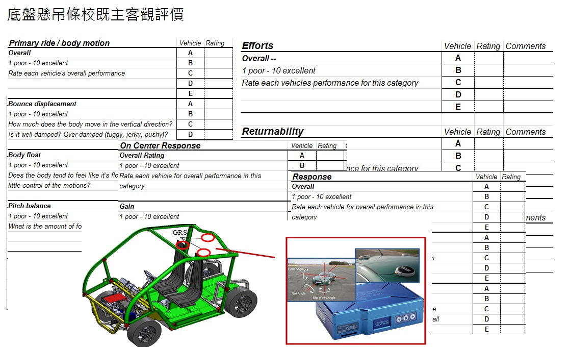 技術現況敘述 建立底盤懸吊調校及主觀評價方法,於競爭車、原型車時期的主觀評價,操控性、乘適性、轉向操作、避震器彈簧、阻尼等調校,應用於國內車輛廠商的需求。