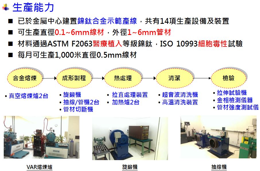 技術現況敘述 本鎳鈦合金技術可生產醫療等級鎳鈦合金管材,並應用於骨科等醫材開發。