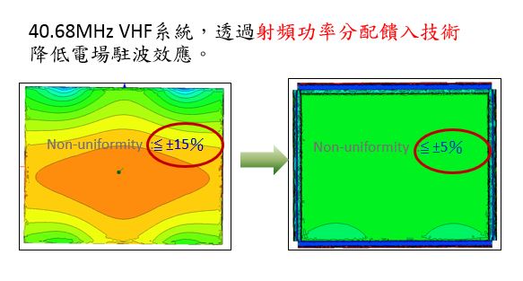技術現況敘述 化學氣相沉積設備(CVD)饋入的功率頻率提升至VHF (30~100 MHz) 以上時,在面積大於1m2以上的基板上鍍膜時將會產生駐波效應 (standing wave effect)。造成電極板上電場不均勻,致使電位分佈不均,進而使得電極板上電漿密度分佈不均,使鍍膜厚度分布不均。 透過射頻功率分配饋入技術可有效消除駐波效應 (standing wave effect),提升電極版上電場均勻性,達到薄膜沉積厚度分布一致之效果。