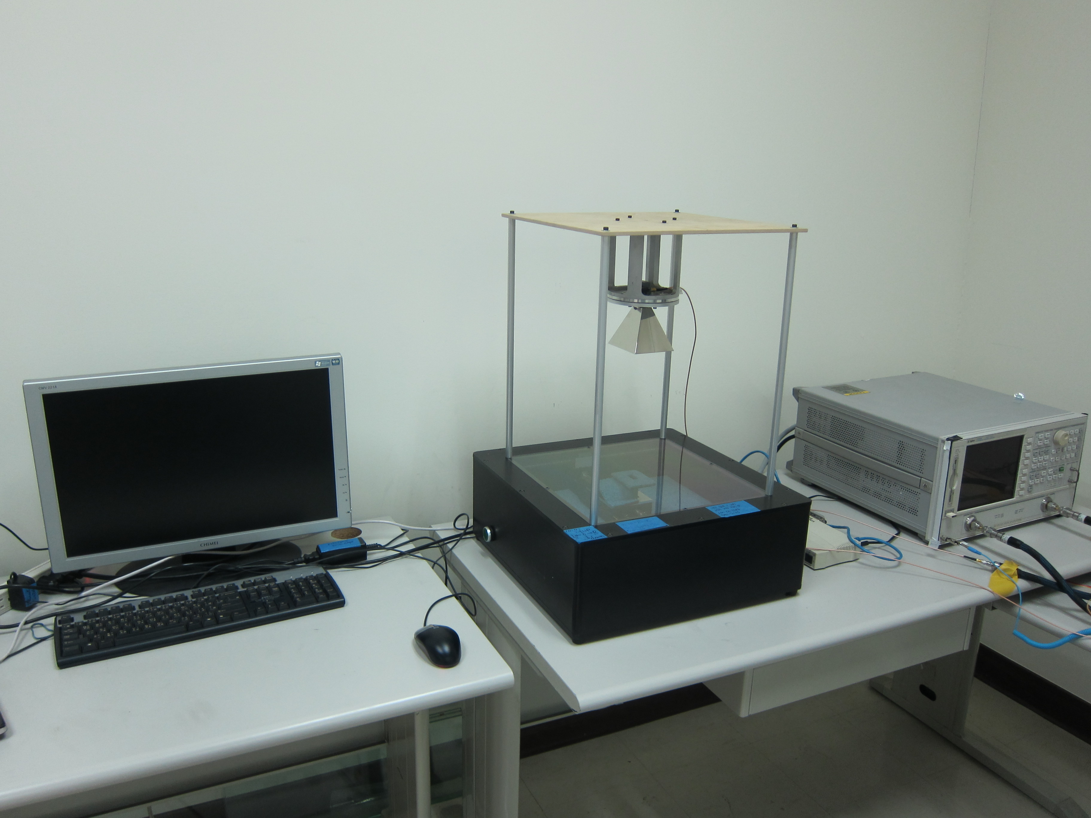技術規格 1. 具有一掃描平台,可掃描面積為25公分x25公分, 掃描時間7分鐘 2. 使用向量網路分析儀(VNA)完成微波訊號的發射與接收。 3. 具一發射天線與接收天線,頻率為9.2GHz 4. 一台windows 8作業系統電腦,執行微波成像演算法,成像時間1分鐘 5.一微波影像後處理模組,可改善成像品質,降低70%雜訊