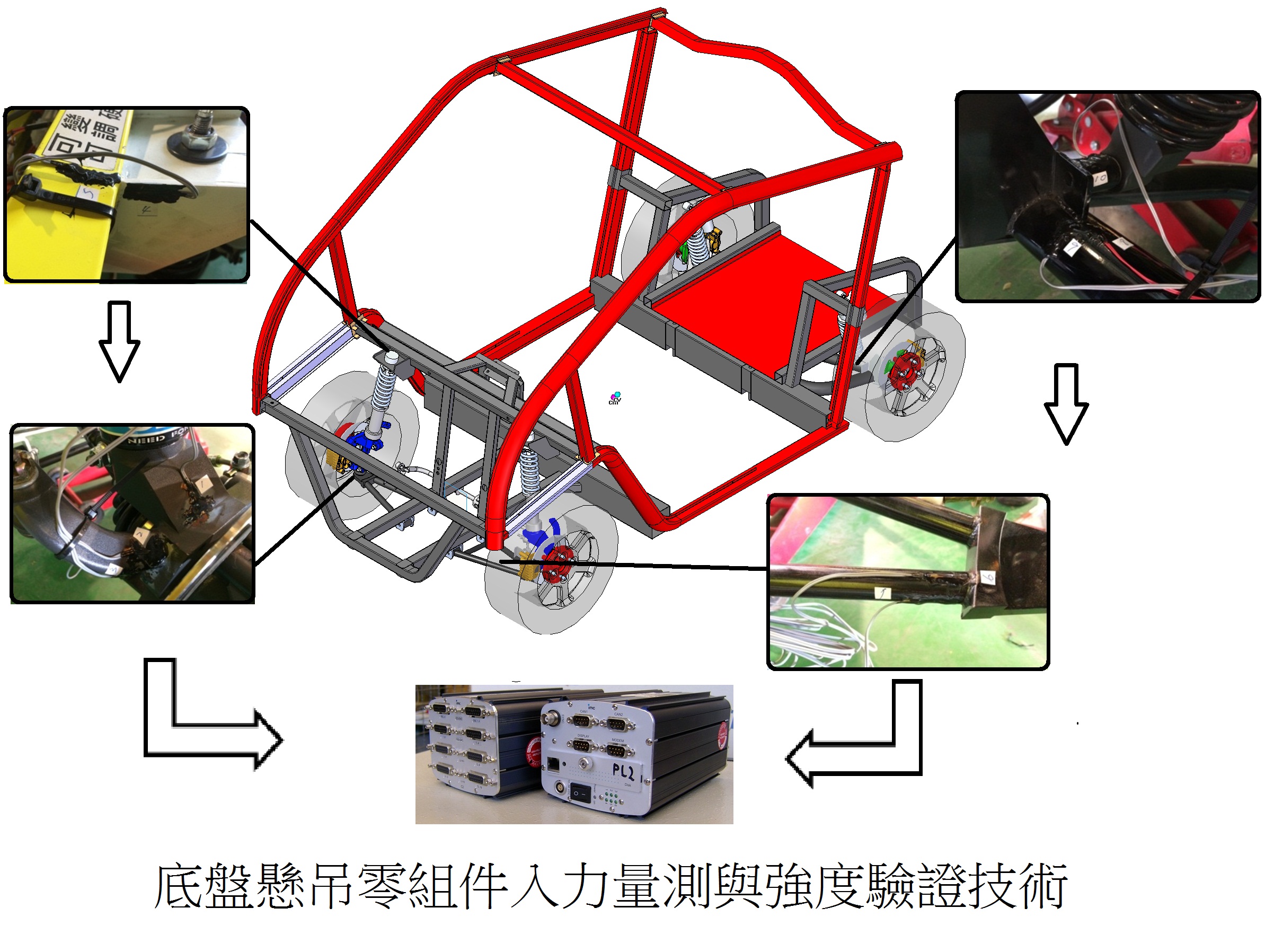 技術現況敘述 建立底盤懸吊零組件實車結構強度驗證技術,透過各項量測器材如應變計、加速規、位移計等感測器架設於零組件應力最大位置點,進行實車各種路面車體入力量測,取得應力、加速度等資料,用以確認零組件結構強度符合國內外各廠規規範與需求。