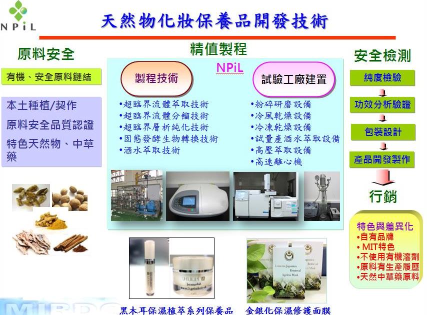技術現況敘述 提供化妝品快速試製技術服務平台,以本土在地原素材協助六級產業的開發。鏈結一級農業安全生產栽種,並以二級製造快速試製平台作為產品加值與試量產之利器,搭配功效性及安全性的檢測驗證,最後整合三級行銷與推廣,真正落實天然物化妝品研發成果之產業化。