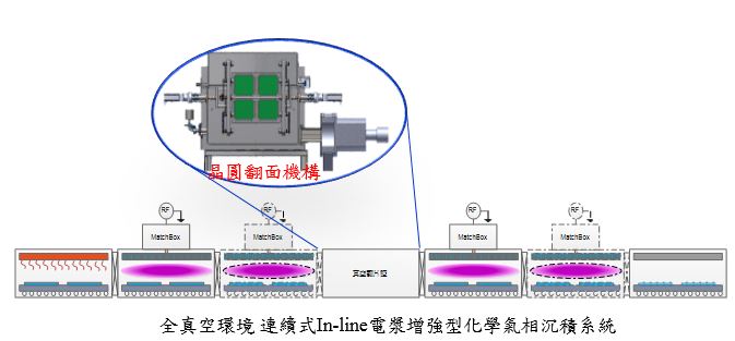 技術現況敘述 本技術主要目的在真空連續式生產設備設置一晶圓翻面機構,具有複數個傳動滾輪,及載片機構,可於真空環境將晶圓進行翻面及傳輸,藉由上述結構,將晶圓傳輸到單台製程腔體中可鍍製i/p/i/n等多重材料薄膜,或多台製程腔體分別獨立鍍製i、p、i、n及鍍製透明導電薄膜,此晶圓翻面機構具傳送及翻轉能力的軌道,可不出真空環境下作業達到連續生產的目的。