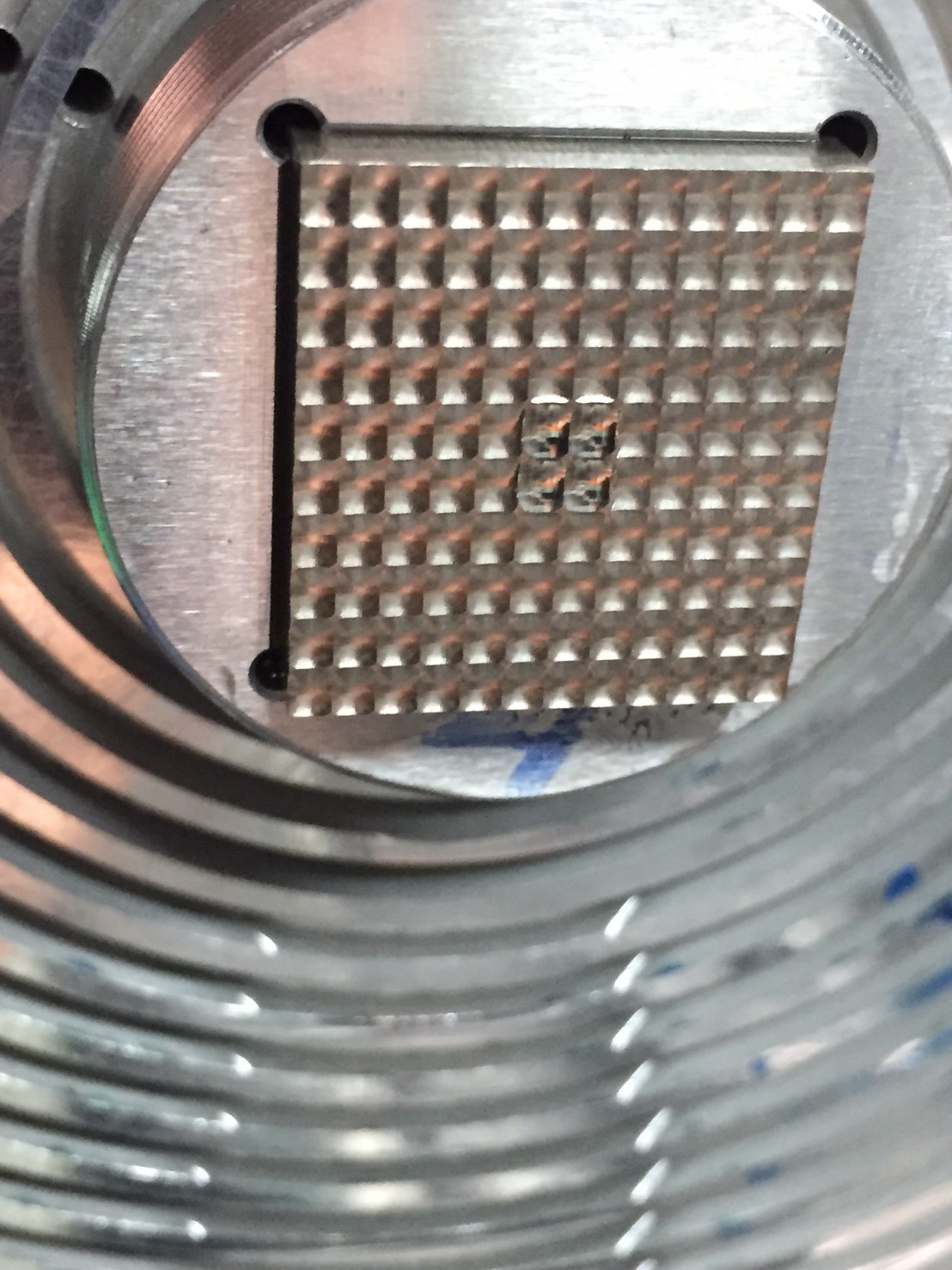 技術現況敘述 目前陣列透鏡結構多係以銑削(Milling)方式進行加工,雖然可獲得所需外形但是形狀精度無法提高。另外受限於銑刀尺寸,單一透鏡尺寸皆大於1㎜以上。本項技術應用超精密加工能量,可加工0.1㎜之透鏡,同時可獲得更佳之形狀精度及表面粗糙度,有效提高產品品質。