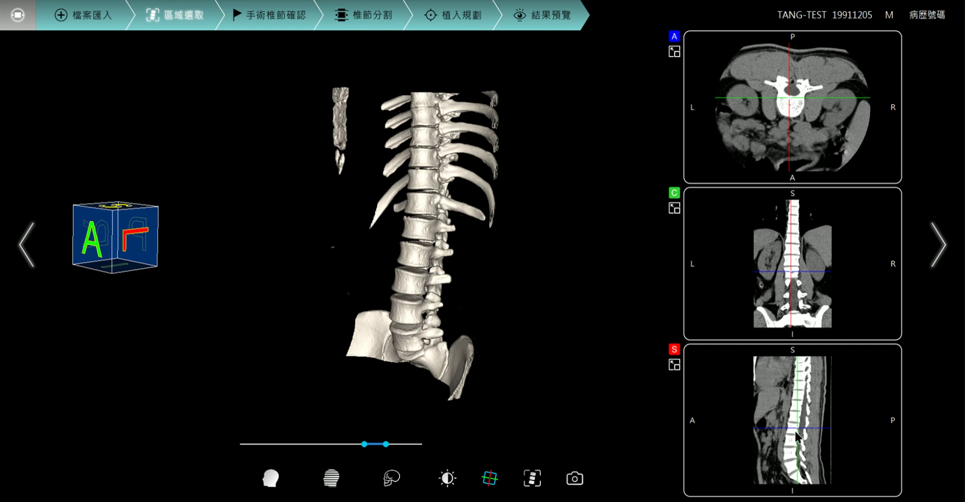 技術現況敘述 本技術包含一套完整骨科植入物植入路徑規劃立體影像輔助流程,其特點可透過演算法,針對特定硬骨組織,如脊椎,進行區塊分割,將原始單一模型分割成數個獨立模型區塊。