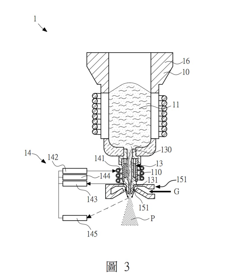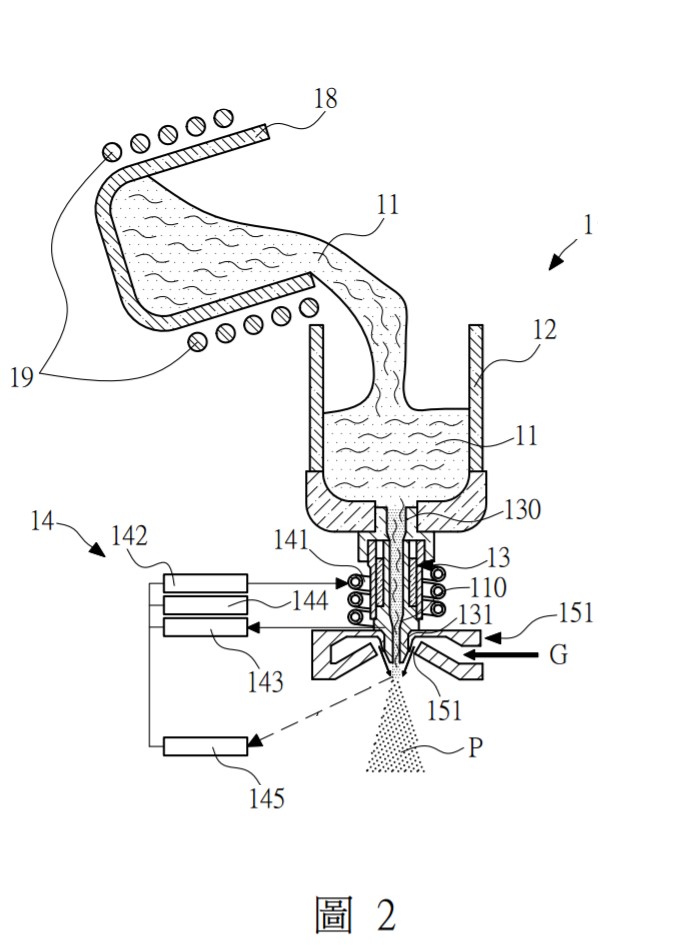 技術現況敘述 本技術之熔湯超溫控制裝置,包括一坩堝單元、一組合式熔湯輸送管、一感應套筒、一感應線圈、一噴嘴單元及一溫控單元,進行熔湯型態及熔湯超熔溫度的調控。坩堝單元所供給之熔湯通過經感應線圈環繞之輸送管,同時對感應套筒及輸送管內部熔湯進一步感應加熱,產生一超溫熔湯。該溫控單元量測並計算該超溫熔湯通過噴嘴後溫度,並調整該感應線圈之功率,以達成預定超熔溫度之控制,並搭配合適的噴嘴設計來達成生產球形合金粉末的目標。