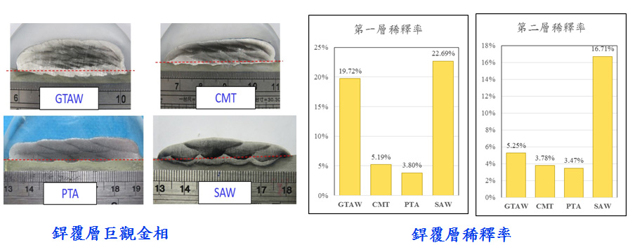 技術規格 導入CMT、電漿粉末覆面銲等低稀釋銲接工法,提升覆面銲層品質,改善潛弧銲稀釋率過高需銲3~4層之缺點,A570基材之覆面銲層稀釋率達小於5%。