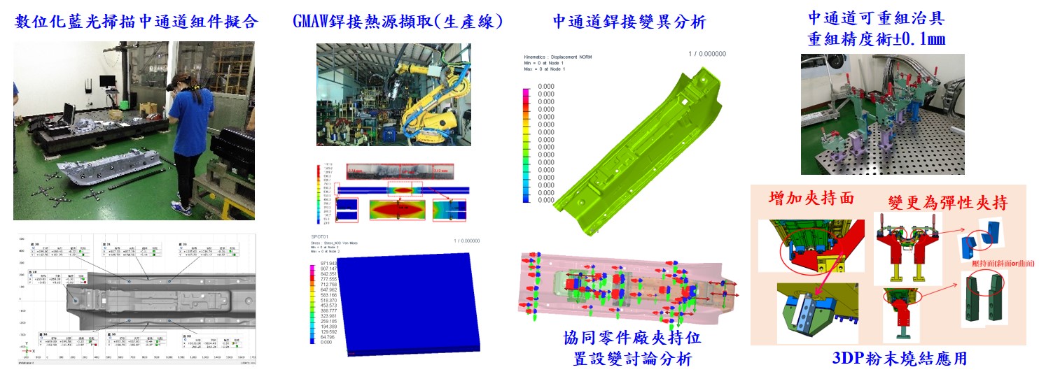 技術現況敘述 面對少量多樣的試作開發,或是跨級距模組化設計快速試作對應與變更,導入模組化可重組治具技術,配合異種異厚鋼模組組裝變異解析(GMAW、SPOT製程),協助業者於乘員艙模組開發中,導入數位量測擬合技術、模組異種異厚組裝變形CAE分析技術(JSH590R、SH270C、JAC270D等)及模組重組治具開發(導入3DP技術應用),填補試作供應鏈缺口,縮短試作開發時程與成本,提升試作開發品質及產品競爭力。