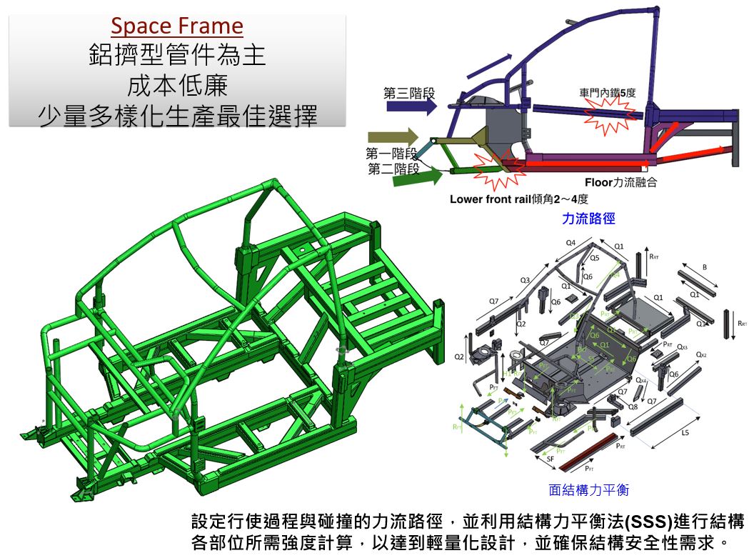 技術現況敘述 確定利基車底盤開發需求後,取得所欲安裝零組件重量與外型基本資訊,利用Simple Structure Surface(SSS)力平衡法規畫足夠保護乘員艙的力流趨勢(Load Path)結構強度與整車剛性需求,再以Space frame結構依規畫進行車體結構設計,其中包含高剛性材料、高面積二次矩等管件等應用,使整車結構抵抗彎曲、扭轉能力上升,達到輕量化效果
