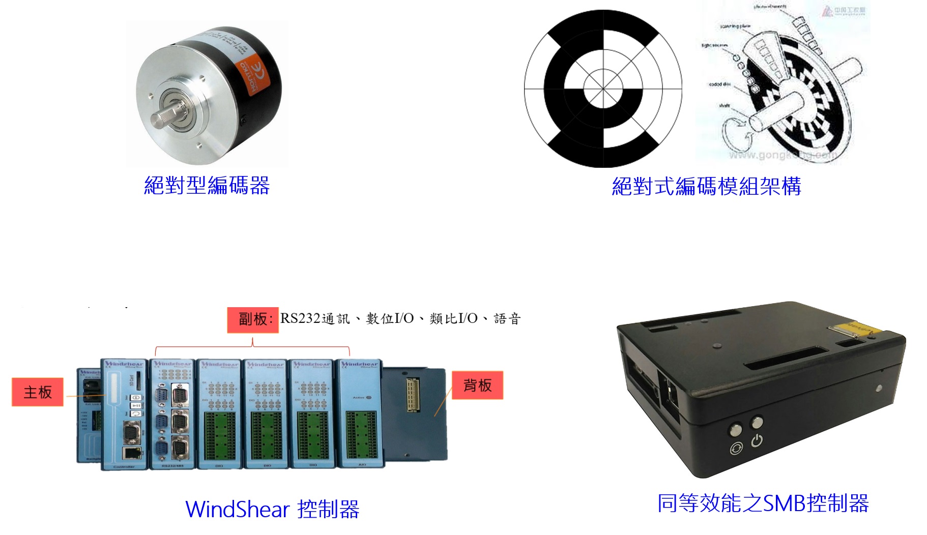 所需之主要軟硬體設備 絕對式編碼模組機構、邏輯控制器與IO輸入輸出端子模組。