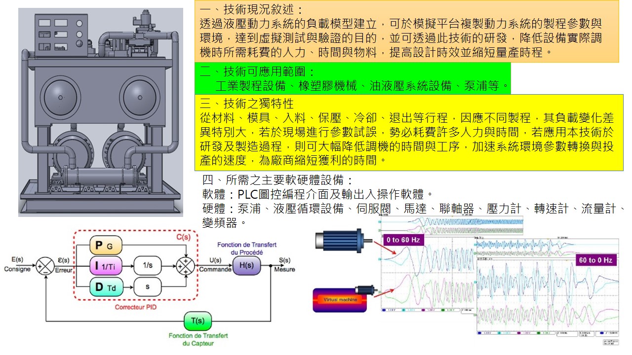 技術現況敘述 透過液壓動力系統的負載模型建立,可於模擬平台複製動力系統的製程參數與環境,達到虛擬測試與驗證的目的,並可透過此技術的研發,降低設備實際調機時所需耗費的人力、時間與物料,提高設計時效並縮短量產時程。