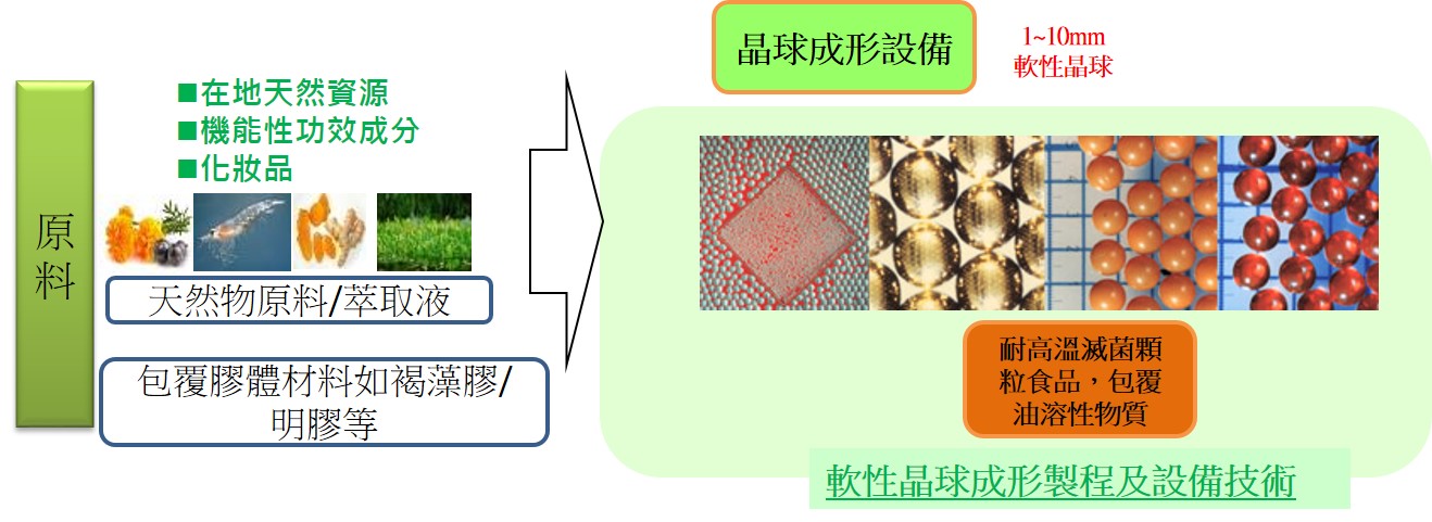 技術現況敘述 晶球當作一種微粒包裝技術,藉由不同的高分子聚合物當壁膜,包覆著固體或液體之核心材料。根據不同壁膜的厚度與性質,能夠改變溶解度與分散性、讓液體形式的食品可以轉變為固體、降低揮發性、保護機能活性、防止營養物質損失,以及增加吸收效率等功能,國際上廣泛應用於保健食品與化妝品工業中,但國內學研單位投入此領域者甚少,商業量產案例不多。