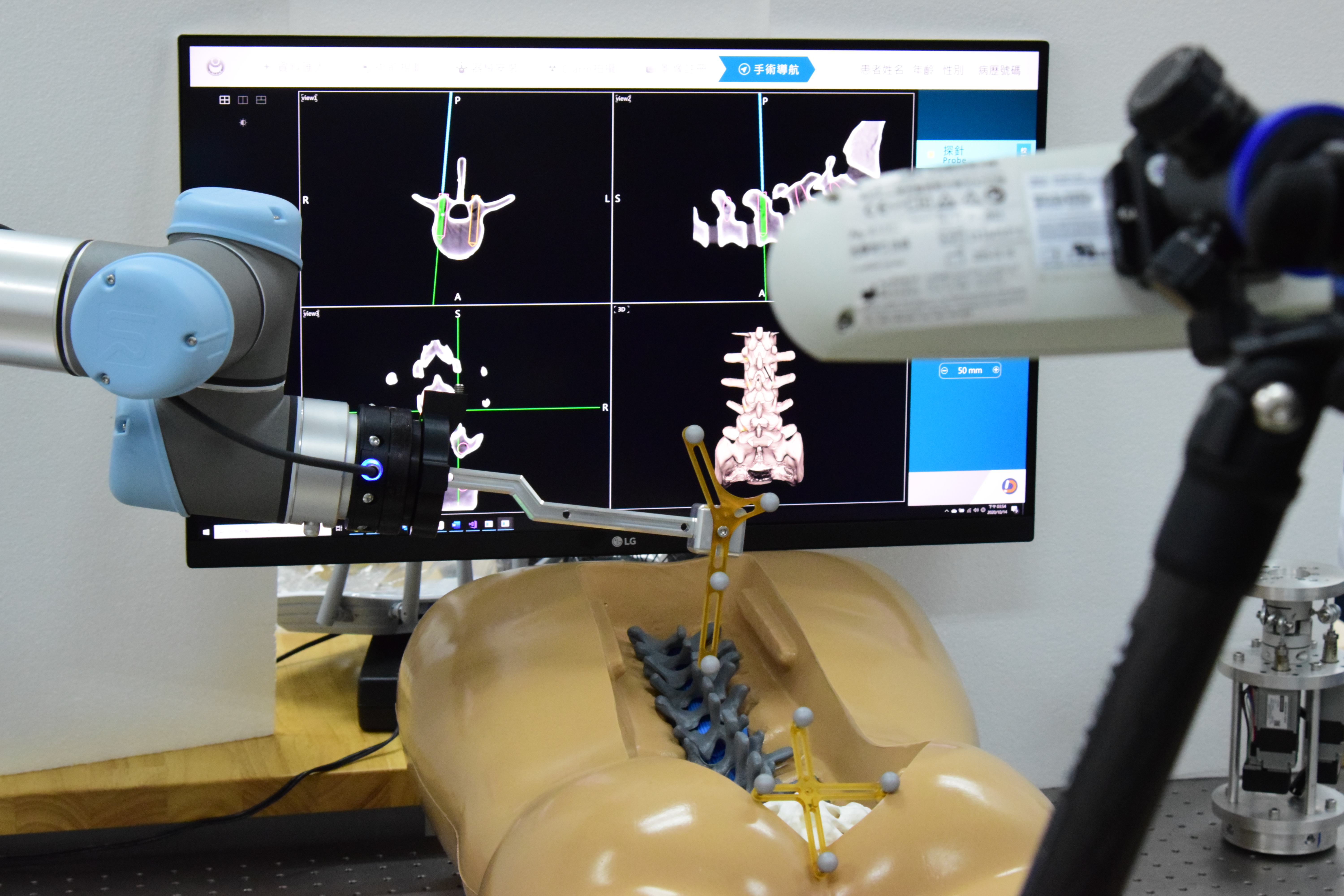 技術規格 利用點雲耦合演算法,耦合手術機械臂系統座標以及手術導航規劃工具系統座標,透過標準治具進行測試,其移動至目標區域之位移精度為RMS 1.73mm