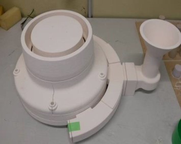 技術規格 一體形精密鑄件用陶殼鑄模,降低開發成本與週期30%以上。整合數位化造模,利用殼模厚度不同,控制陶殼模各區塊熱傳、冷卻速率,達到控制內部金屬液凝固的方向及時間,延長補縮,提高良率,提升航太、綠能元件、國防、渦輪引擎大型零件高值化產業快速開發與驗證,以莫來石為依據,目前為7元/kg,大理石廢棄物1.2元/kg,加入研磨/造粒/過篩/火法,成本約可控制於4.8元/kg,每年莫來石進口量約為上千噸,預估可降低陶殼模背襯材耗材成本30%以上