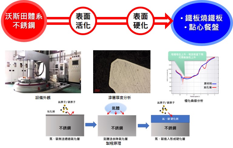 技術現況敘述 熱處理/表面處理在製造業的產業價值鏈中扮演提升產品附加價值的關鍵角色,若能提高質軟的沃斯田鐵不銹鋼的表面硬度,使之兼具耐蝕性與耐磨性,則其附加價值與應用領域將大幅提升。目前國內熱處理業對沃斯田鐵不銹鋼以光輝(固溶化)退火熱處理為主,在業界現有的表面硬化處理技術中,氣體氮化與低壓氮化技術因缺乏去鈍化膜技術而無法處理沃斯田鐵系不銹鋼;離子氮化技術與鹽浴氮化技術則是量產性不足及會導致耐蝕性嚴重劣化,真空氮化技術之表面硬度偏低(≦Hv400)且處理溫度高,亦即產業仍欠缺量產型的沃斯田鐵不銹鋼耐蝕性無損表面硬化處理技術與產線。