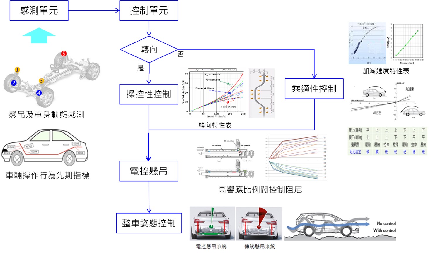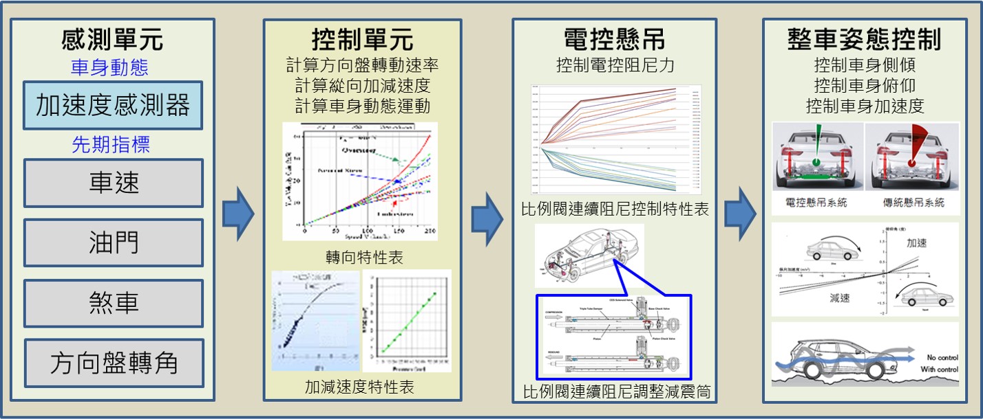 技術現況敘述 適應性懸吊系統技術整合可調阻尼避震器及動態路況感測器,依路面及駕駛行為進行懸吊參數控制。適應性懸吊系統採高響應比例閥作動器控制,可提供穩定、迅速的調整避震器阻尼力,對於行駛不同路況時可即時調整作出反應,提供開放參數調整,結合懸吊基礎閥式樣調校,搭配出適當的阻尼控制範圍。