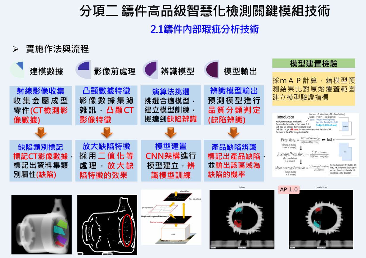技術規格 1.AI影像辨識技術搭載影像檢測設備, 2.AI影像檢測表面刮傷、裂痕、凹坑等外部瑕疵辨識 3.內部的複雜缺陷是否有氣孔、縮孔、冷裂等內部瑕疵檢驗