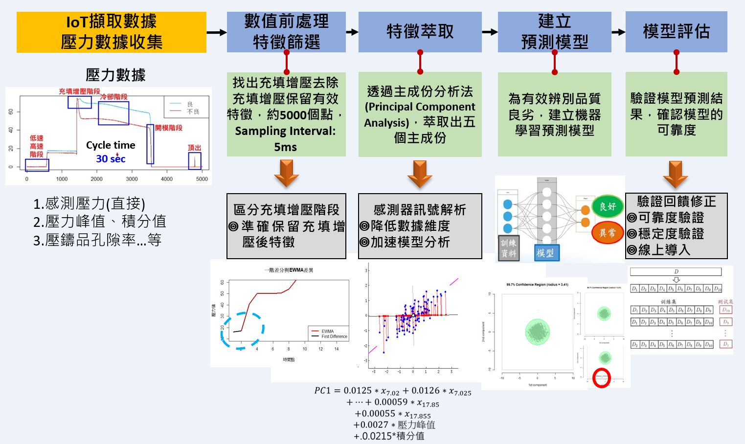 技術現況敘述 建立壓力數據分析暨品質預測模型,將成品成型製程壓力感測收集且數位化,擷取成型製程(成型、流動)之壓力曲線及機台設定參數,解析製程中材料成型與受力變化,透過試驗數據全檢,完成壓力感測數據及AI數據分析(機器學習)界定不良品進而使發展成形品質,建立金屬製品及相關產品製程中AI成型壓力數據擷取及品質預測分析技術