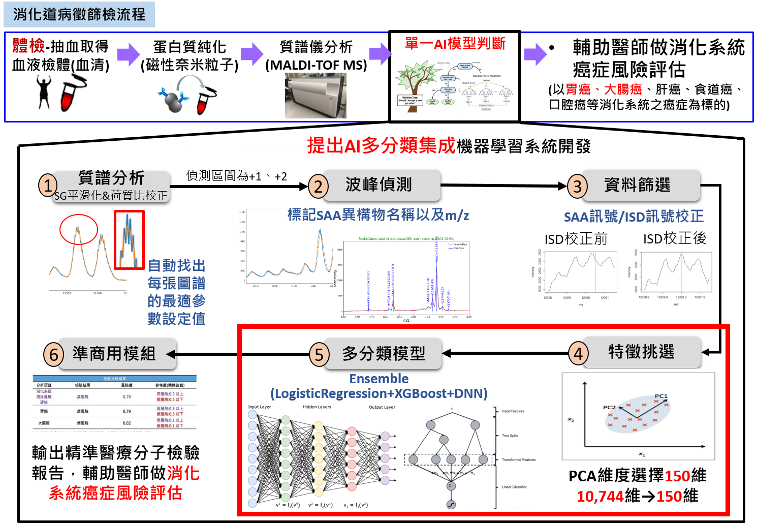 技術現況敘述 提出一奈米質譜檢測預測技術,將抽血檢驗血液中的SAA蛋白質異構物收集且數位化,解析奈米粒子純化及質譜儀解析(MALDI-TOF MS分析)異構體,解析血清質譜訊號分析和資料判讀,進而使發展奈米質譜檢測預測,建立以質譜資料為基礎,運用機器學習方法建立預測模型。