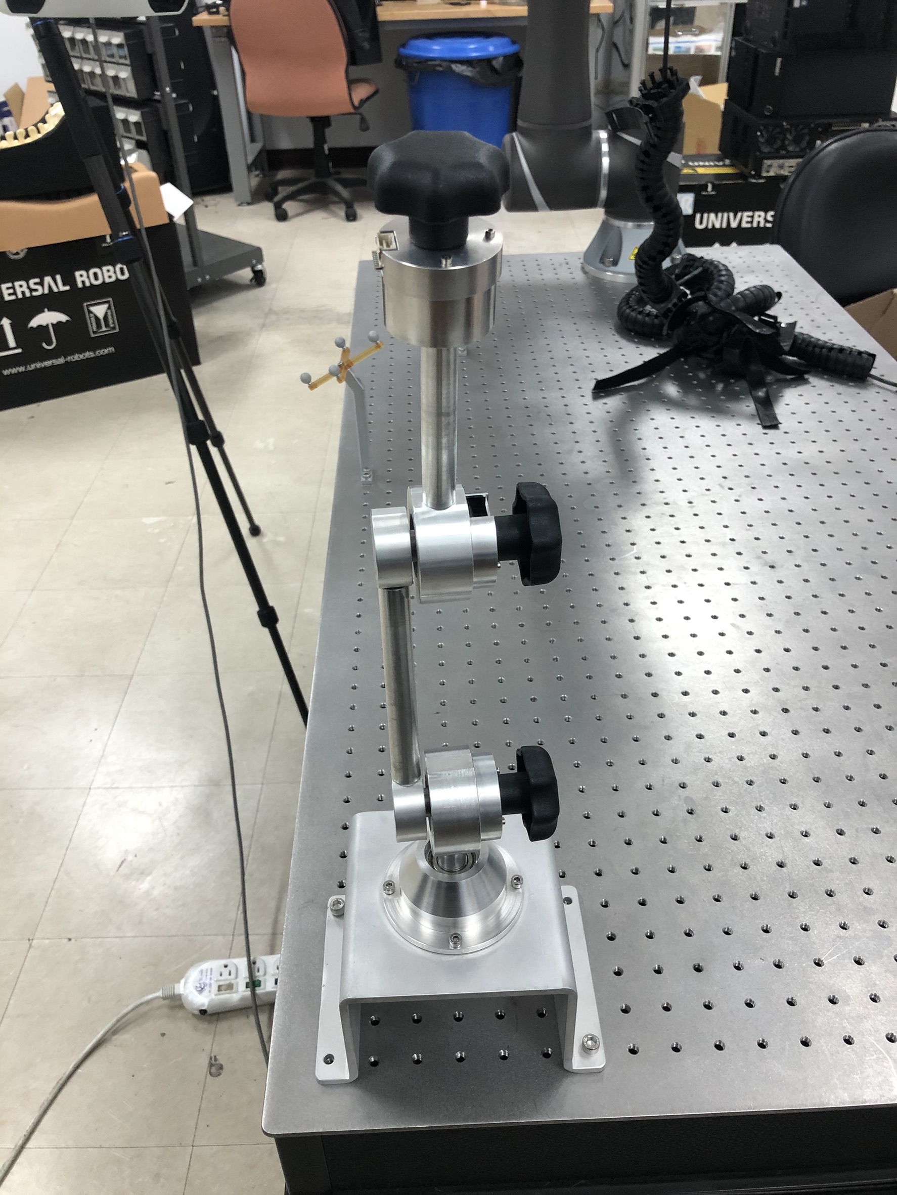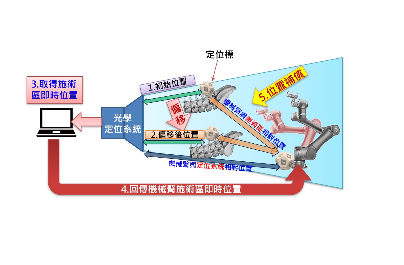 技術規格 1.自動光學輔助機械臂定位模組: 透過編碼器量測關節角度確認即時定位模組位置及姿態。可自行移動機械臂基座上之光學定位模組至鏡頭可照射位置及照射面,當術中因手術站位遮蔽鏡頭或光學元件污染清潔,需要移動機械臂基座上之光學定位模組,可不須重新註冊基座之光學定位座標系統(.ROM檔)。 2.術中適應性位置補償演算法 利用多目標座標系耦合,定義輔助機械臂基座位置與病患位置座標系統相對轉換關係,在手術初期即透過自動光學定位輔助機械臂定位模組確認機械臂基座於世界座標上之姿態,並將其轉換為手術導航系統上一工具座標系統,因此可透過轉換矩陣運算及時補償,因呼吸律動、施術施力等,所造成的相對位置改變。