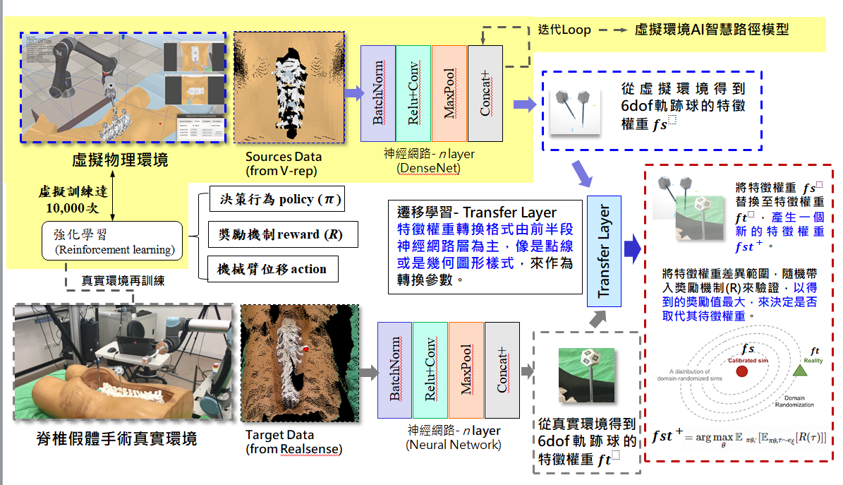 技術規格 此技術是以AI跟機械臂的結合,利用虛擬環境完成訓練模型,再經由特徵權重移轉,平行轉移到硬體載具,達成虛實環境整合。