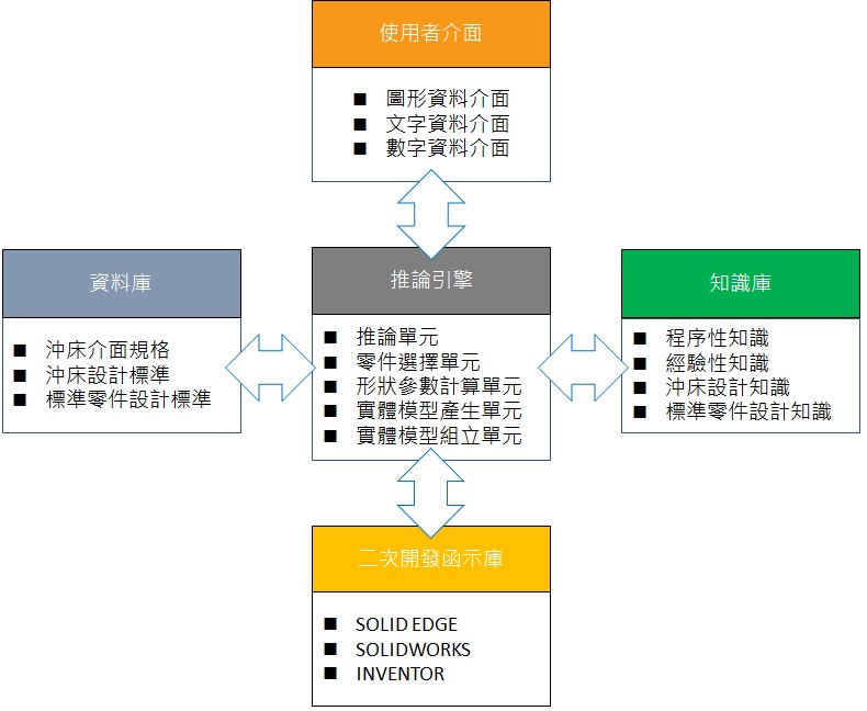 技術現況敘述 本提案使用CAD API搭配程式語言進行二次開發模組之開發,建構出以沖床介面規格、 沖床設計標準和沖床設計知識為中心的「沖床設計參數導引系統」。具有沖床設計參數 導引使用者介面、沖床用之標準零件庫、沖床自動零件生成、沖床自動組立等共四項主 功能。