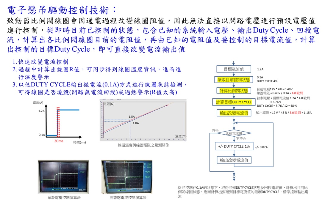技術現況敘述 本技術於致動器電流控制上採即時監測回授訊號,透過事先實驗建立致動器特性表,由多項回授資訊綜合查表取得致動器即時運作狀態,提供系統進行控制及檢測相關參數,如即時的致動器線阻值、致動器溫度狀態,由致動器即時狀態及特性表,計算欲達控制目標的電流值時,系統應輸出控制訊號之工作週期值,完成準確快速的進行電流的改變