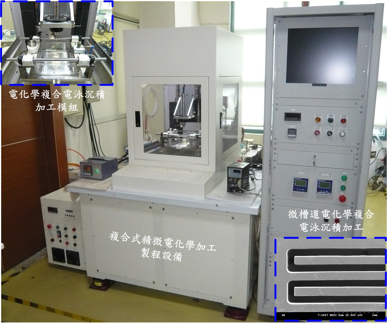 技術現況敘述 複合電泳沉積模組與電化學加工製程設備技術,透過線上微細電極製作,電化學加工電場與流場分析與複合加工製程設計,搭配複合製程專用夾治具,可加工出表面粗度達0.02umRa之微細溝槽,達到高品質與高精度之微特徵加工效果。