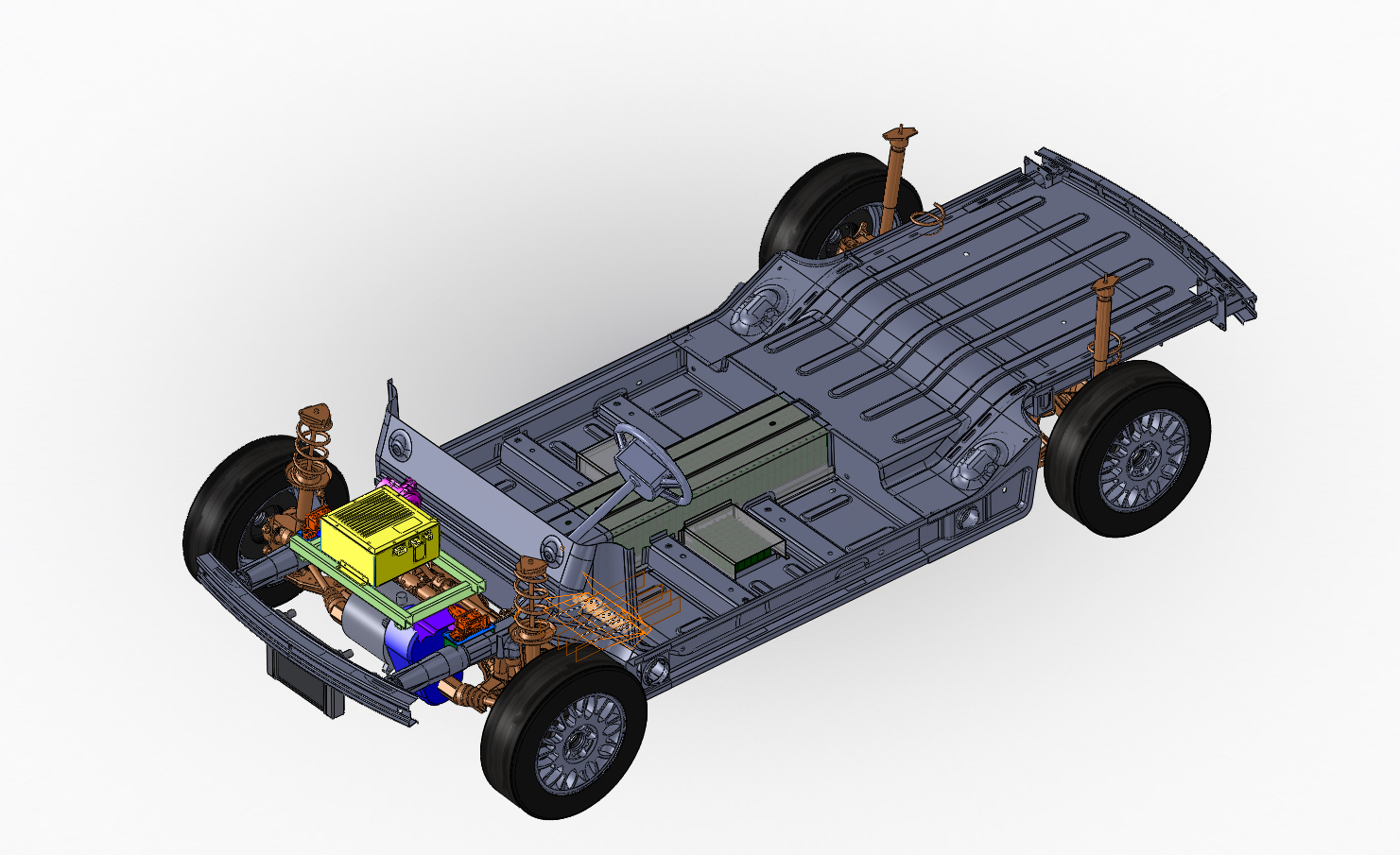 技術現況敘述 模組化設計,材料方面採用高強度鋼/鋁合金,製程導入管件液壓成形技術,且考慮底盤與電池盒結構一體化設計,達到輕量化之目的。此外電池盒設計為可拆卸式,考量到未來車廠/客戶進行電池抽換或維修時的方便性。目前已完成第一代電動車彈性化底盤Layout設計,可技術移轉國內廠商。
